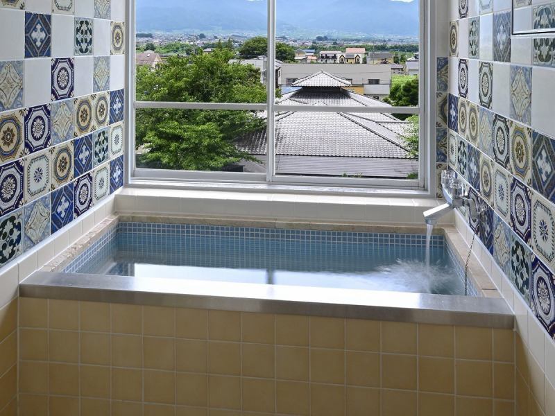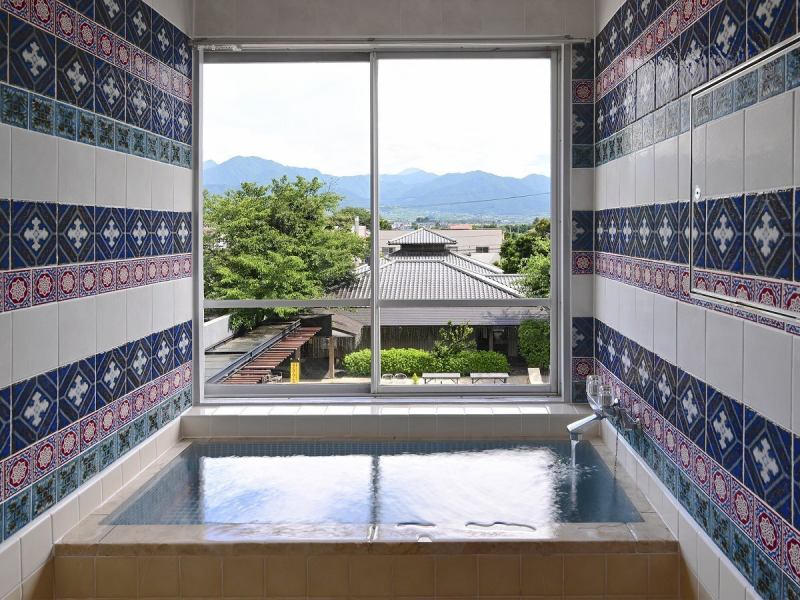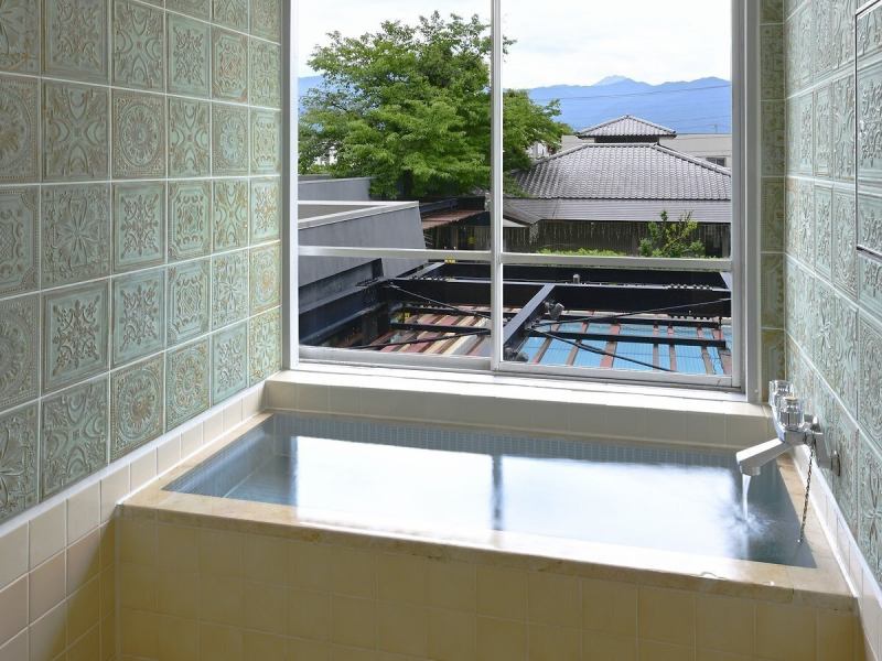 レトロタイルで彩られた客室風呂も天然温泉です。