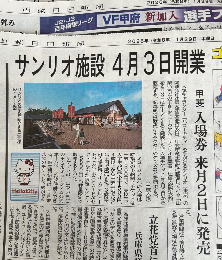 お知らせ イベント NEW 2026.01.29 サンリオ施設 4月3日 OPEN Screenshot 山梨いちごの王さまミュージアム、 辻信太郎記念館(サンリオ創業者・山梨県甲府市出身) 2026年4月3日OPEN、チケットは2月2日発売です。 詳しくはこちら サンリオミュージアム オープンは4月3日 チケット販売は来月から 山梨 前の記事 一覧へ戻る
